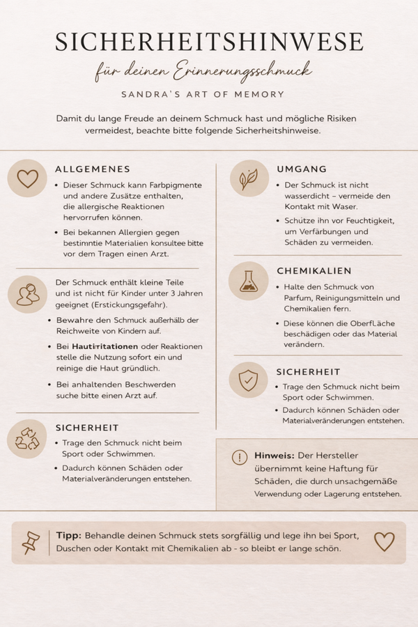 - Der Hersteller übernimmt keine Haftung für Schäden, die durch unsachgemäße Verwendung oder Lagerung des Schmucks entstehen.